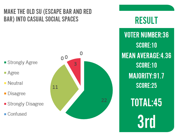 - Re-vamp and re-open escape bar, as a 'pub-like' place to go, for students who do not always want to go to the club nights at the new SU