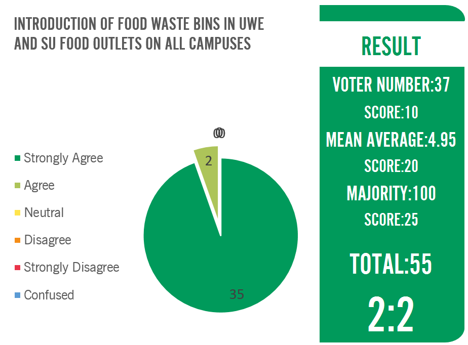 Introducing food waste bins in UWE and SU food outlets on all campuses. The food waste can then be sent to an anaerobic digestion site where it can be made into biogas and fertiliser. Biogas produced from the digestion can be used to provide vehicle transport fuel for Bristol's Bio-buses, or to supply homes with energy.