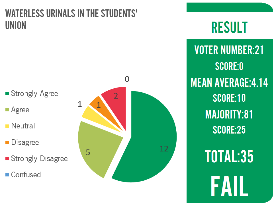 We're always hearing boasts from restaurants and other establishments with waterless urinals that they have saved X-number of gallons of water per year. Since the Students' Union is often so forward-thinking in its green policy, why not take this extra step to make significant savings of water?