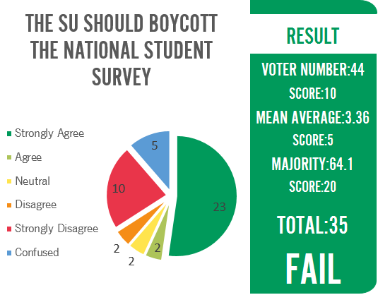 Extra Information: We believe the SU should boycott the National Student Survey (NSS) for the academic year 2016-17. We believe this as NSS results could lead to a tuition fee increase as part of the Teaching Excellence Framework.?