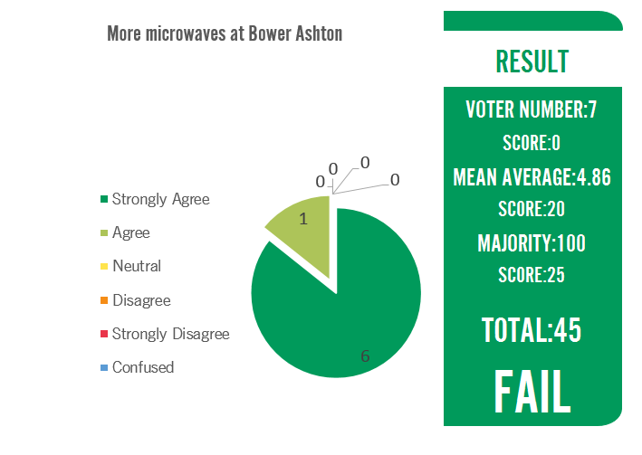 Extra Information: With one microwave we wait in the queue for up to 20 minutes during our short lunch breaks. Please get us more microwaves and clean the living organisms taking over the existing one.