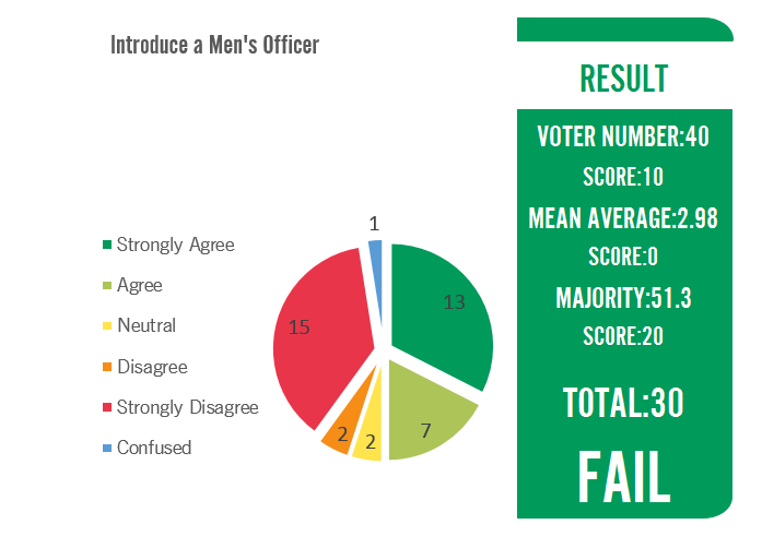 A motion was submitted for the introduction of a Women's Officer, it is only fair in the interest of equality that Men also have a representative to fight on their behalf on issues that face men.
