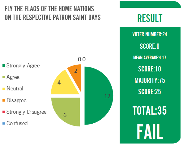 Extra Information: As a British institution and a university in England, it is important that we recognize St George's, St Andrew's, St David's and St Patrick's Day. This would be best done by flying the respective country flags on the flag pole outside the SU.