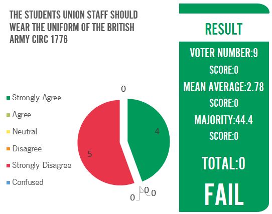 Extra Information: The Students Union currently wear out of date ONeil jackets which are a disgrace. To keep The Students Union to be fit for the future all staff should be required to wear British army Redcoats. They are practical and timeless.