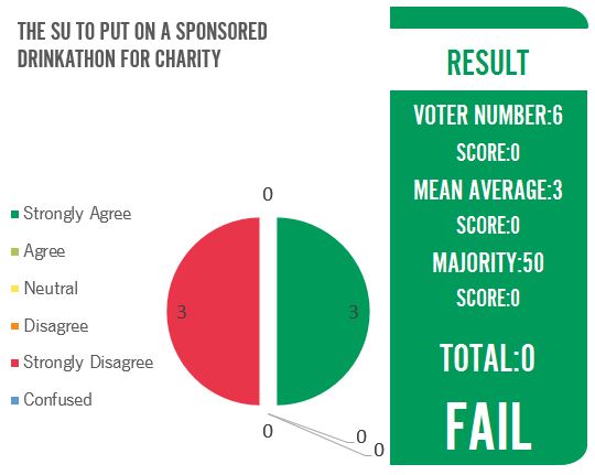 Extra Information: The Students' Union is currently seeking to reduce drinking. With this in mind, The Students Union should show commitment to student culture and British production by having a 24 hour drinking marathon at reduced prices, with all profits going towards RAG.