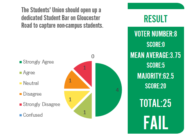 Extra Information: Currently The Students' Union has bars at some of the campuses limiting profit which will then be spent on students due to student holidays. Therefore The Students Union should open up a bar on Gloucester Road for non-campus students with reasonable prices which will provide a secure income for The Students' Union all year round.