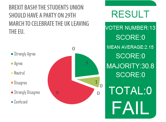 Extra Information: The United Kingdom will be leaving the EU on March 29th 2019 at 23:00. To celebrate this momentous occasion The Students Union should hold a patriotic Brexit Bash for all students to celebrate becoming an independent sovereign nation together.