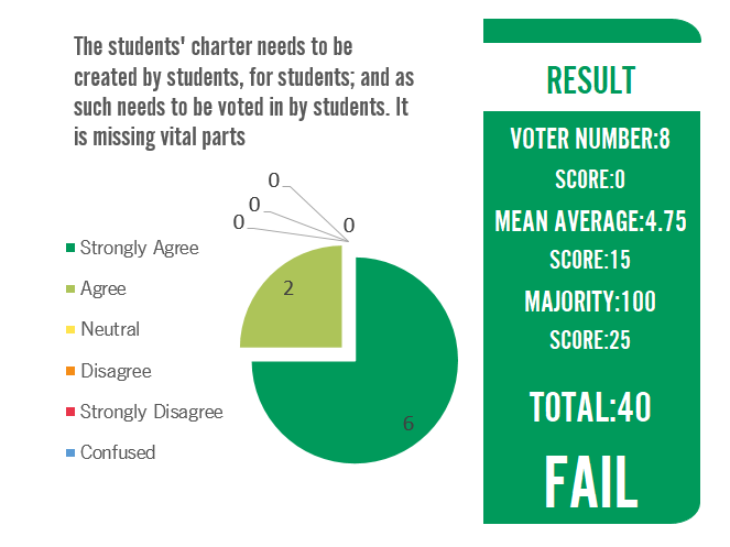 Overall, I believe this charter was rushed through to tick a box and our wonderful student body was not used to inform the creation of this. We can do so much better than this. I vote for a student consultation on this - not just council but all students from across the campuses. We could include so much more - the university needs to be promoting physical and mental health.