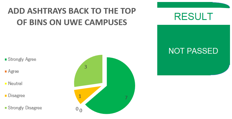 Extra Information: Due to a change in university policy all ashtrays were removed from the top of bins in an attempt to reduce smoking around Frenchay campus. However, this has only led to cigarettes being stubbed out on the flat tops and the butts falling onto the ground around the bin. Not only is this unsightly  and ineffective, but it damages the environment around the bin and generates more work for the Grounds Team. Therefore, the ashtrays should be put back on the top of the bins around Frenchay campus.