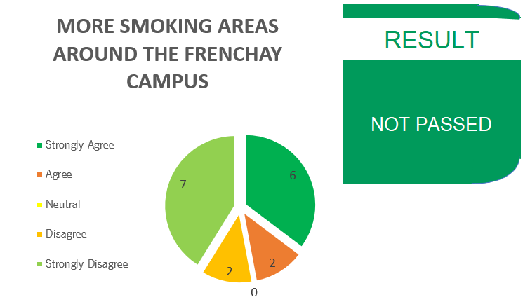 Therefore I believe the University should create more smoking areas spread across campus where students can smoke more than 10 meters away from buildings and not in main thoroughfares where they could affect other students health. With more smoking areas available the University should then use security to enforce the no smoking within 10 meters of building rules.