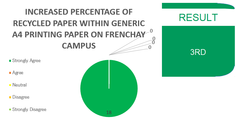 Extra Information: During the 2030 Sustainability Plan consultation meeting in March 2019, the procurement team mentioned the percentage of recycled paper in the generic A4 printer paper had decreased significantly in the 2018-2019 academic year. If it is possible they should move to using A4 printer paper that has the same or higher percentage recycled than they did pre-2018-2019 academic year.