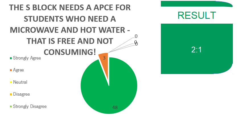 The S block is one of the only blocks to not be within easy access to a microwave and free hot water. I personally waste precious time queuing in the library and One Zone to use the microwave and have spent silly money on hot water for my own tea. The library hot water space is not fit for humanities students who require spending most of not all of their time in S block.