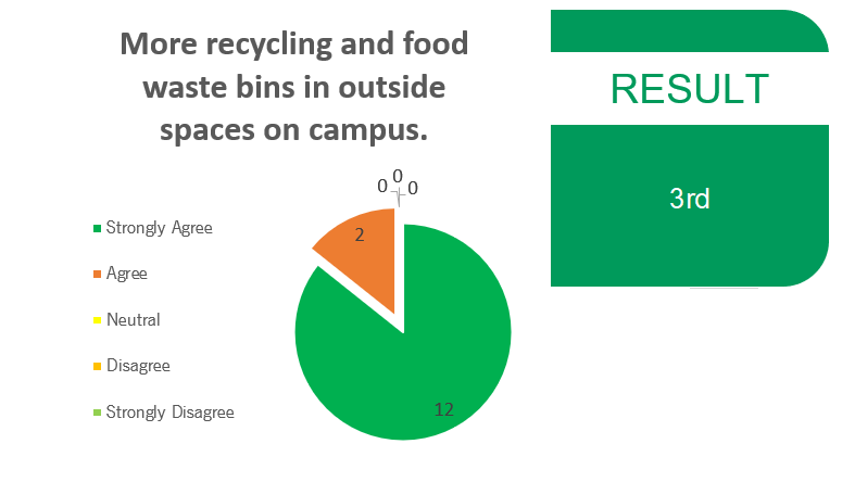 Clear bins that display, cardboard, glass, tin and food waste sections are needed as it will reduce the amount of food waste and recyclable items going to landfill. Food waste is one of the main causes of greenhouse gas emissions therefore, if less is put in landfill it can be correctly disposed of and potentially be used as a renewable energy source. The UK is still not set to reach the 2020 recycling target therefore, the university can improve its recycling habits by providing more bins outside rather than just general waste bins.