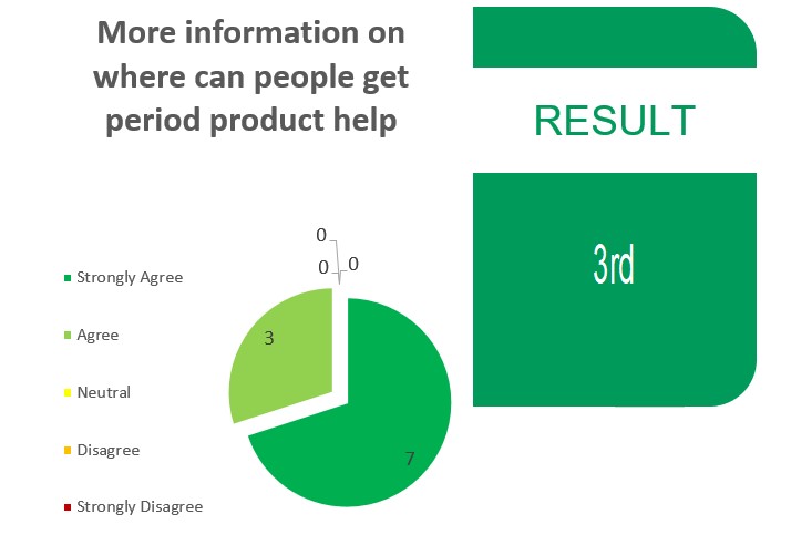 Extra Information: A lot is being said around period poverty at the university. It would be great if students who need help with accessing period products could easily know where to go. Training should also be provided for staff who will handle this very sensitive situation and it would be imperative to address cultural sensitivities with staff. It might be easier for students to speak to females for instance.