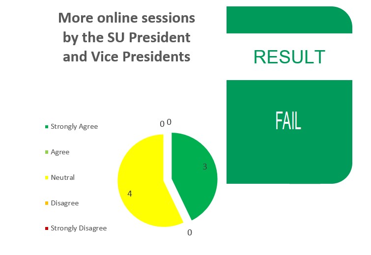 Extra Information: At the start of lockdown, the SU President and Vice Presidents hosted weekly online sessions for students to drop in. It would be great to see these return as students need someone to virtually engage with face to face. Not everyone can comfortably express themselves over email and for many, messages get lost in translation.