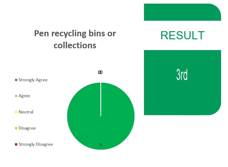 Extra Information: It would be helpful to have collection points or bins around the campuses so that pens which no longer have enough ink to work can be recycled. Many primary and secondary schools around Bristol and South Gloucestershire have these collection points, so it should be relatively easy to set up. This can help students, staff, and the university as a whole to work towards being more environmentally sustainable. I'm sure that many students and staff throw away pens pretty frequently, and all of this waste could be reduced by having collections/drop-off points for these pens