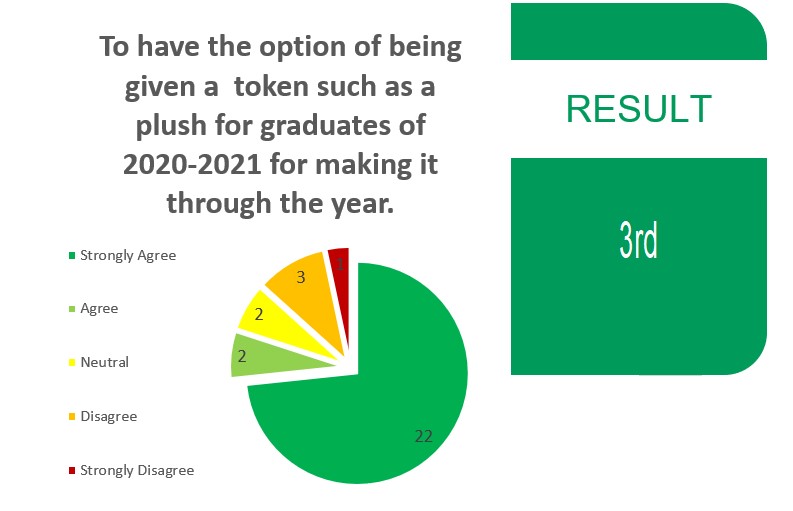 Extra Information: This year has been hard on everyone and especially the soon-to-be graduate students. We were notified that due to uncertain summer, our graduation in July is postponed until further notice which is sad and stressful for everyone. Due to that, I suggest that the graduates should have an option of being sent a plush in graduate attire in July to remind them that they have succeeded and made it through this year! This will remind the students of how they faced the year 2020-2021 and made it through, as well as they will have a small souvenir and a memory which will not be forgotten of.