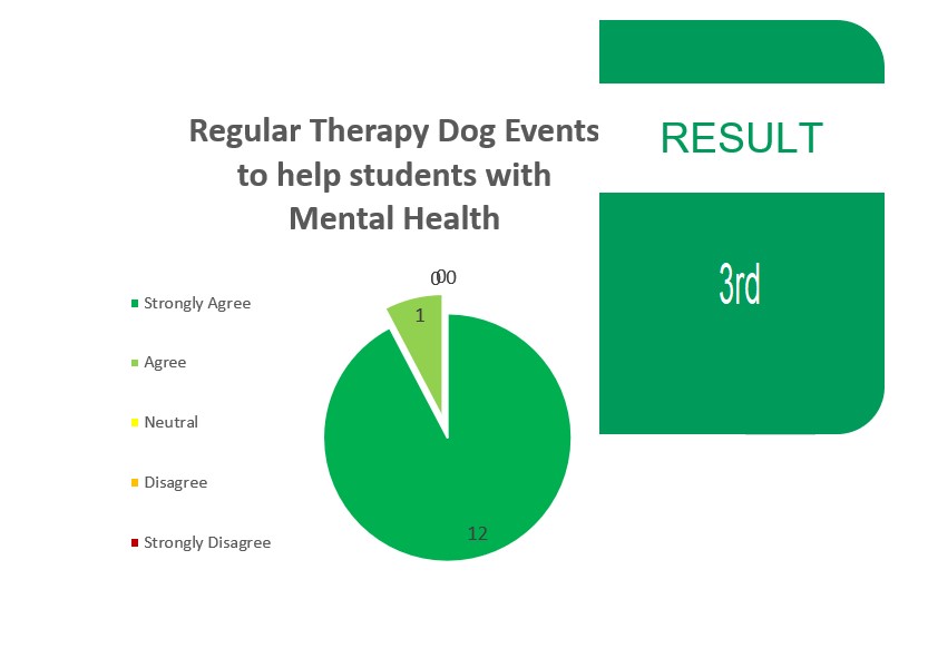 Research has proven that regular interactions with dogs can help reduce stress and anxiety in people, as well as improving their mood in general. So my proposal is to have regular therapy dog events around campus to give students access to a bit of stress relief in the form of a cuddly pup. My old college had a library dog that would be there all day once a week so this could be an option also!