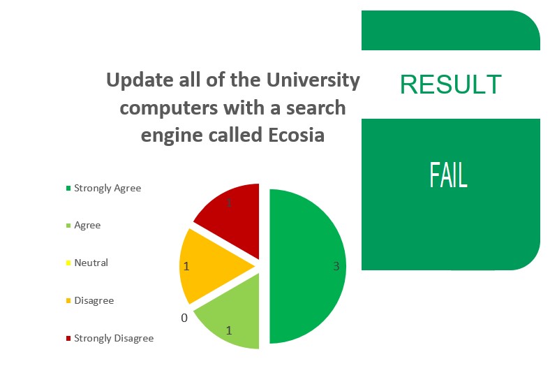 The Ecosia search engine plants trees through every search. They support local partners and non profit organisations that plant trees using the investment from Ecosia. Organisations have also started using Ecosia but imagine how many trees we can help plant as a university with the 31,877 students here (2019).