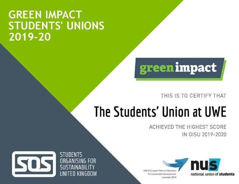 Green Impact 22-23 Highest Scoring Students' Union Award: https://www.thestudentsunion.co.uk/news/article/thesuatuwe/The-Students-Union-at-UWE-wins-The-Highest-Scoring-Students-Union-award/