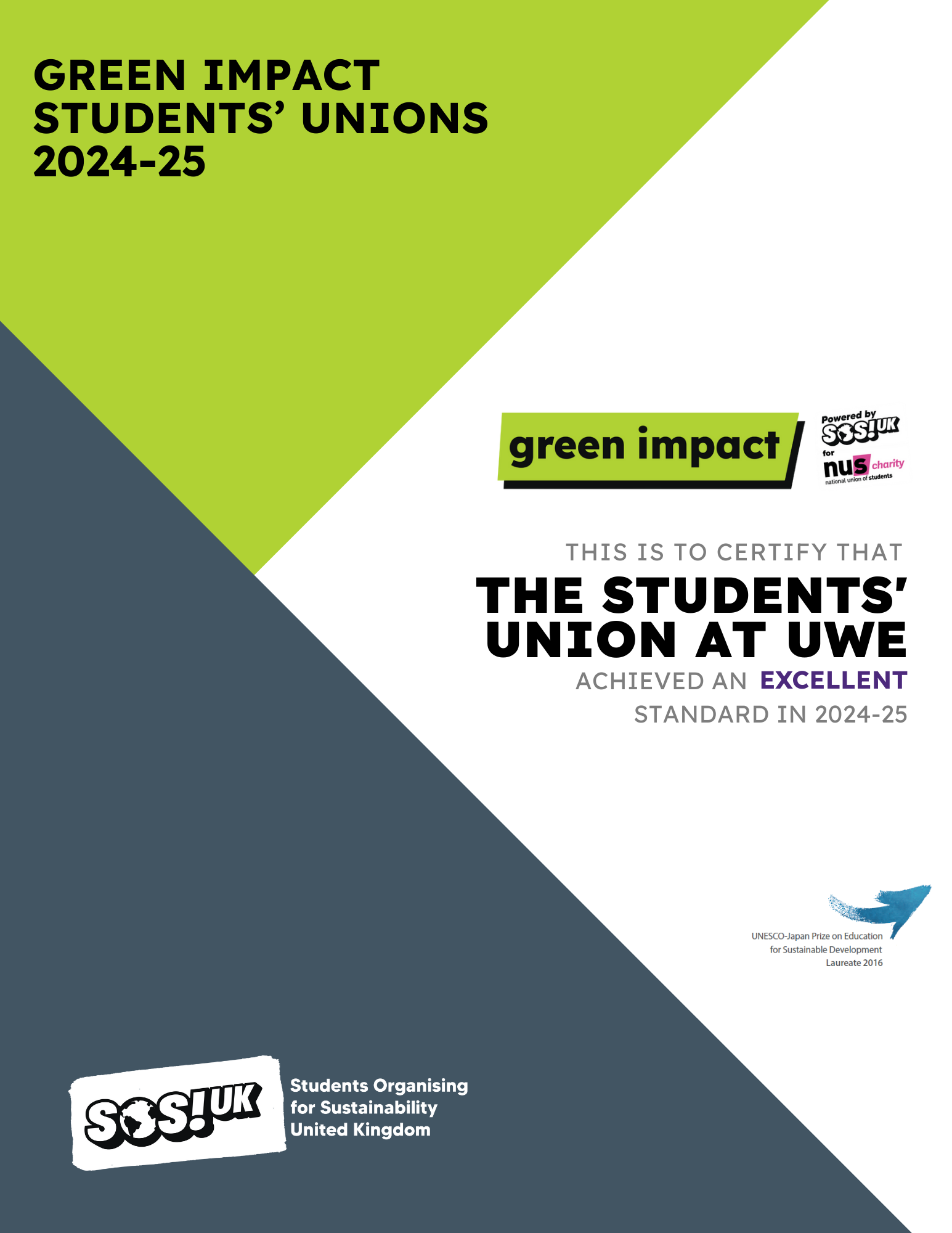Green Impact 23-24 Highest Scoring Students' Union Award: https://www.thestudentsunion.co.uk/news/article/thesuatuwe/The-Students-Union-at-UWE-wins-The-Highest-Scoring-Students-Union-Award-for-Sustainability/